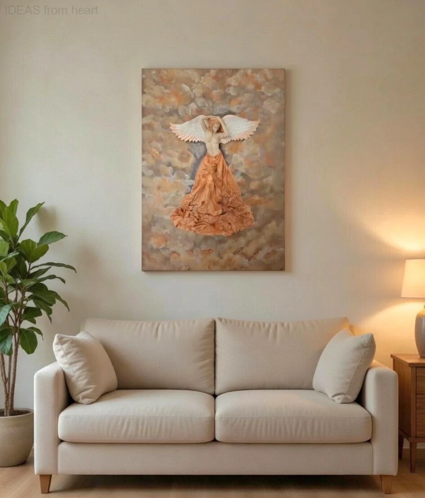 Plastický obraz s reliéfní postavou ženy a křídly vytváří jemný prostorový efekt, díky kterému se obraz mění podle světla v místnosti.