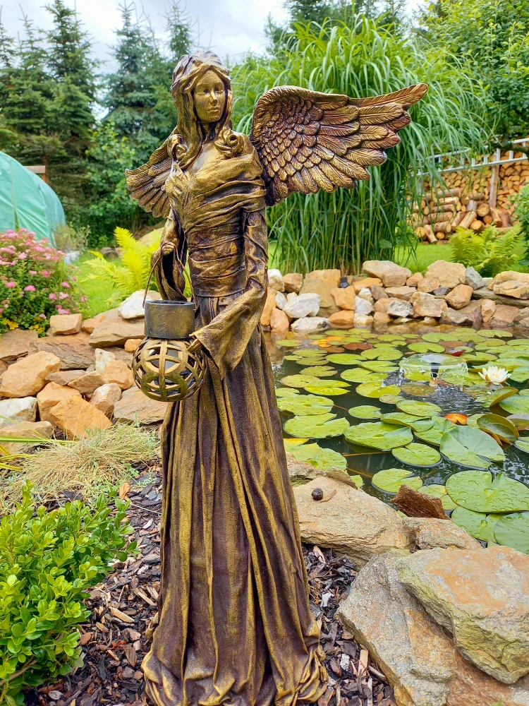 Ručně vytvořená technikou Powertex, andělka vyniká v každém detailu. Zlatá patina dodává její postavě teplý, slavnostní lesk, ať už ji umístíte na zahradu, terasu či do interiéru. Je krásnou celoroční dekorací, která rozsvěcí nejen prostor, ale i duši.