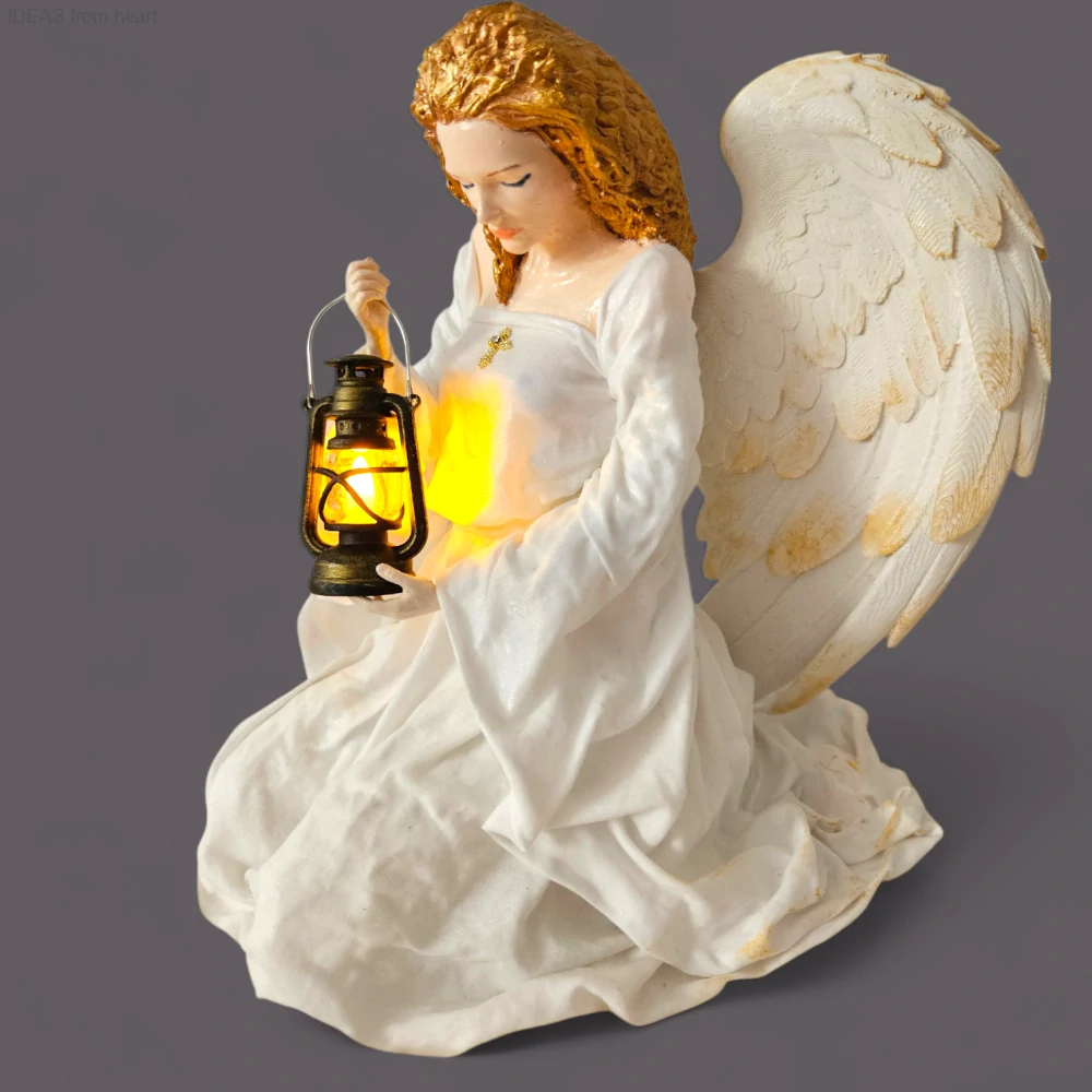 Lucerna v rukou andělky vytváří krásný světelný efekt a dodává této soše anděla jemnou, uklidňující atmosféru.
