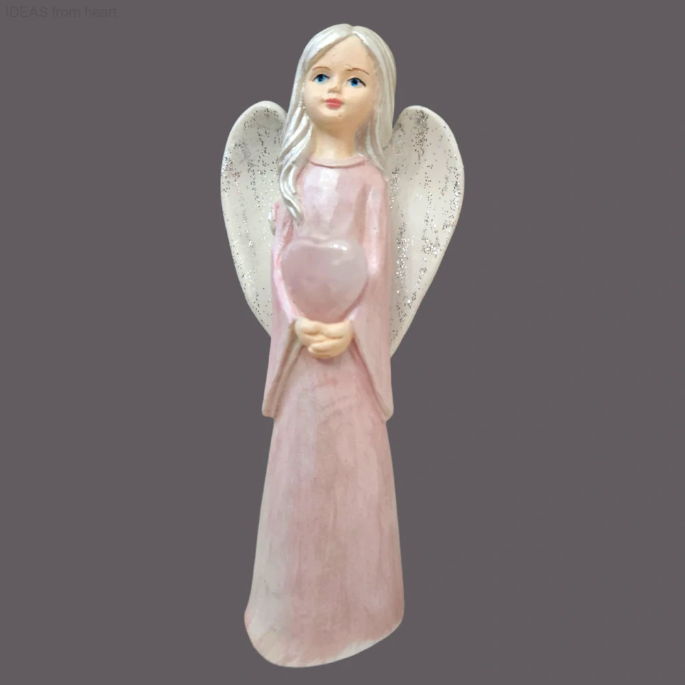 Jemná andělka s třpytivými křídly nese poselství lásky a klidu. V náručí drží srdce z přírodního růženínu – minerálu, který léčí srdce, zklidňuje emoce a přináší do života harmonii.