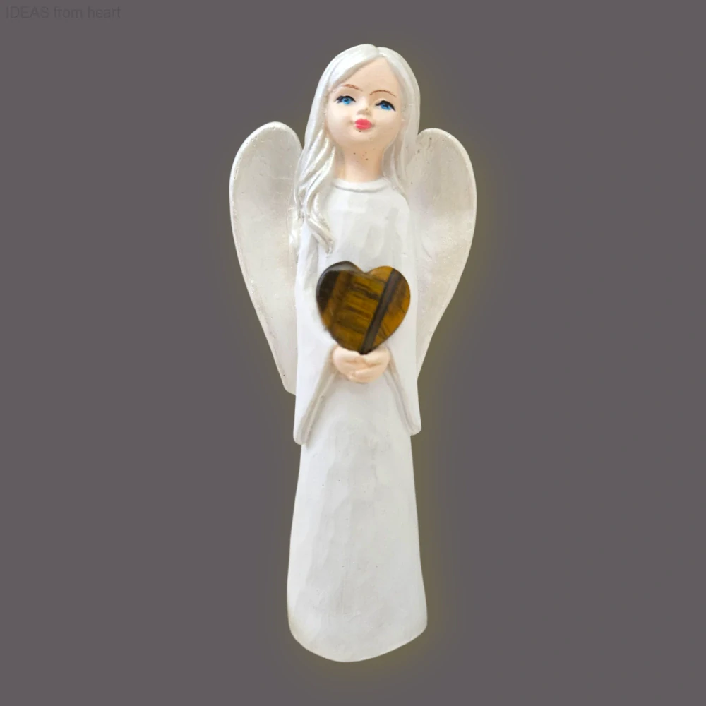 Tato andělka v sobě nese energii klidu, vnitřní síly a ochrany. V náručí drží tygří oko – kámen odvahy, stability a hlubokého ukotvení. Její přítomnost posiluje důvěru v sebe sama a přináší pocit bezpečí do každého prostoru.