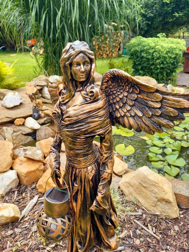 Jako by vzešla z pradávné legendy. Tato bronzová andělka nese světlo v dlani a s něžnou tváří bdí nad klidem každého místa, kam vkročí. Její solární lucerna září jemným teplým světlem, které se tiše rozzáří s příchodem večera – bez elektřiny, bez spěchu… jen díky síle slunce a tichému zázraku přítomnosti.