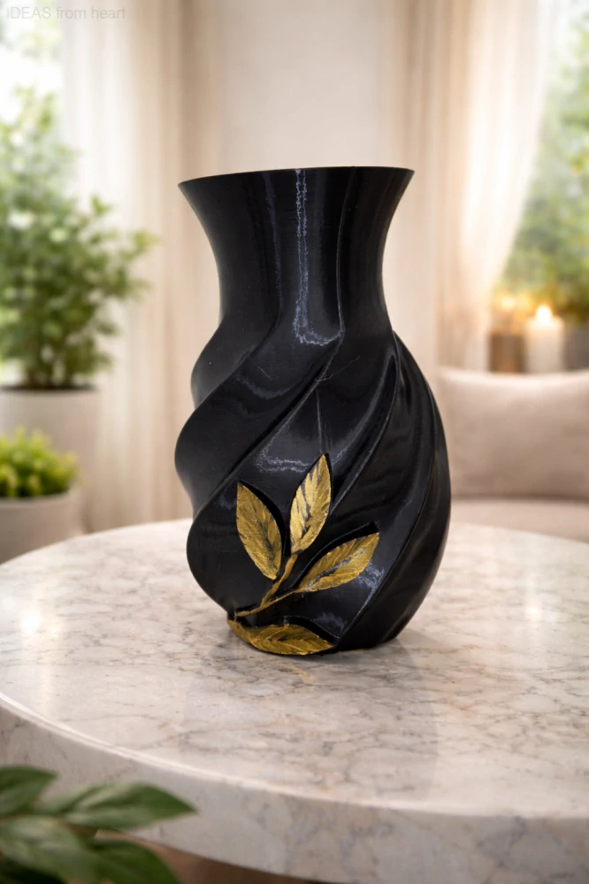 Váza je vyrobena pomocí moderní technologie 3D tisku z kvalitního materiálu PETG, který vyniká pevností a dlouhou životností. Finální lesklá úprava dodává váze elegantní charakter a zároveň zvýrazňuje její propracované linie.