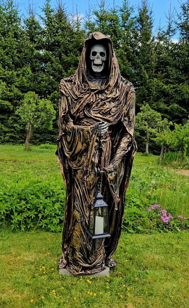 Tajemná postava, která jako by vzešla z jiného světa, nyní může stát na vaší zahradě a bdít nad klidem vašeho domova. Strážce temnot je 180 cm vysoká ručně vyráběná socha kostlivce v majestátním plášti s bronzovou patinou. V jedné ruce drží solární lucernu, která po setmění jemně svítí a imituje plamen – dodává tím celé scéně magickou a mystickou atmosféru.