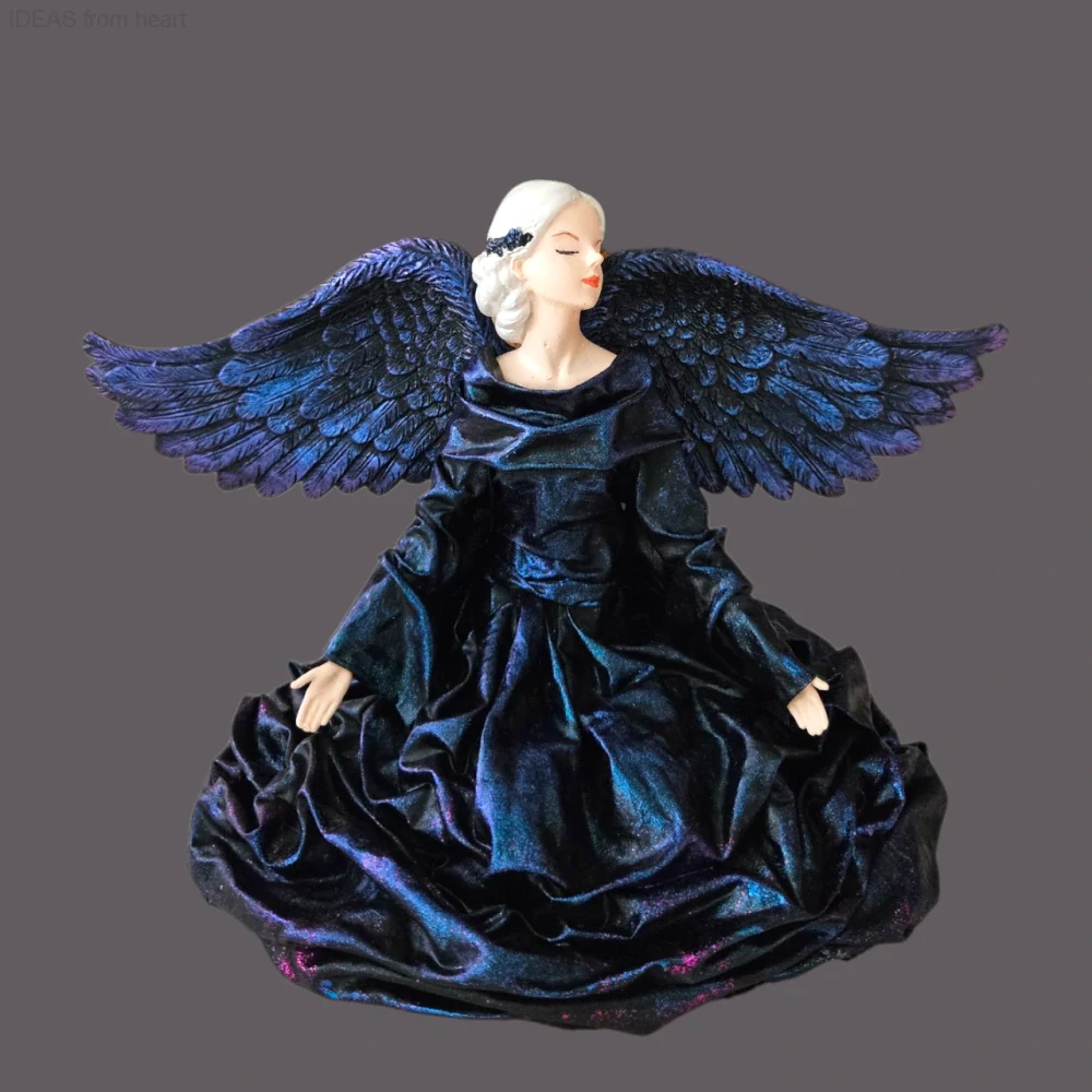 Andělka Aurora je poctou kouzlu polární záře. Její chameleonové šaty se proměňují podle světla a odhalují tóny modré, zelené a fialové – stejně jako noční obloha ozářená tancem světel. V klečící pozici působí pokorně a zároveň vznešeně, jako spojnice mezi nebem a zemí. Jemné třpytky na šatech podtrhují mystickou atmosféru tohoto výjimečného díla.