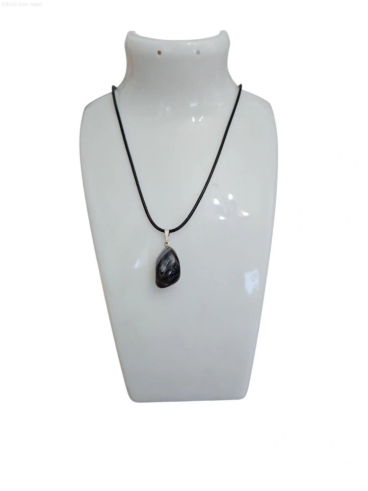 Stylový náhrdelník s přírodním černým achátem (velikost přívěsku cca 2 cm). Zavěšený je na černé šňůrce s kovovým zapínáním a prodlužovacím řetízkem. Dodáváme v dárkovém sáčku – vhodný i jako dárek.