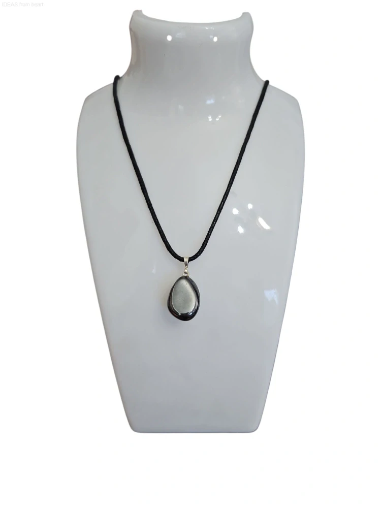 Elegantní náhrdelník s přírodním hematitem (velikost přívěsku cca 2 cm). Zavěšený je na černé šňůrce s kovovým zapínáním a prodlužovacím řetízkem. Dodáváme v dárkovém sáčku – ideální i jako drobný dárek.