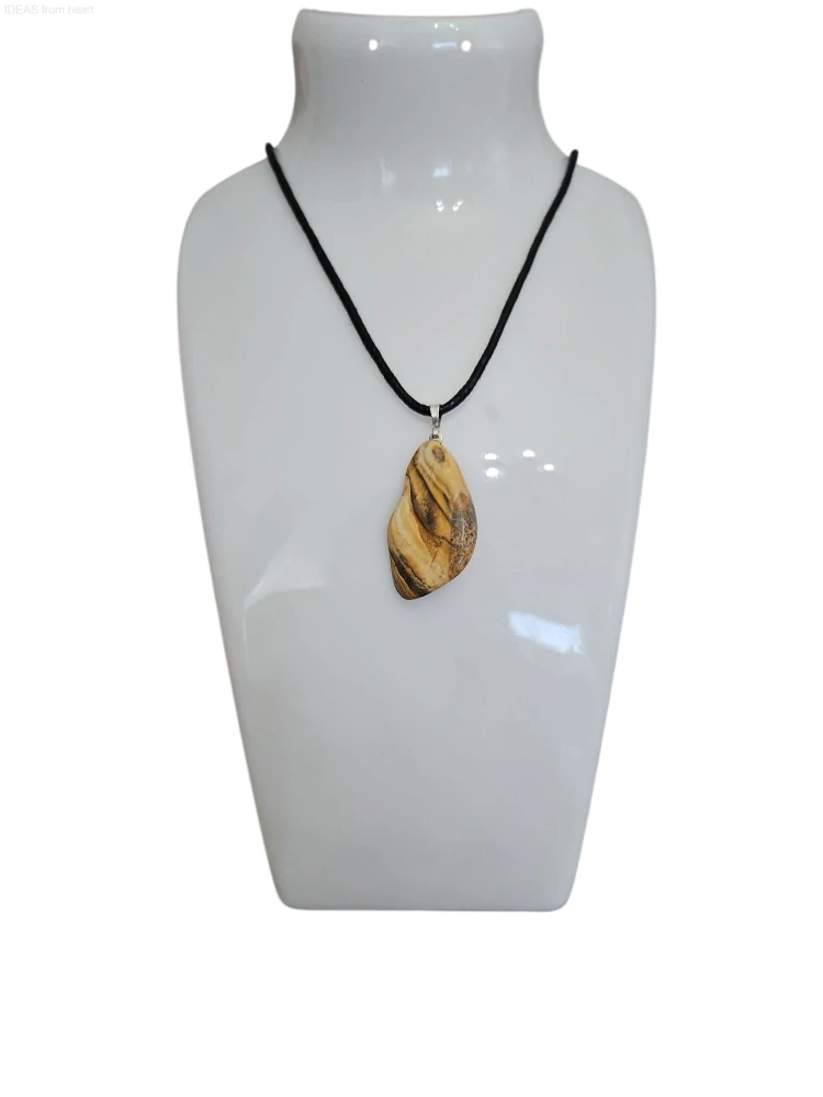 Originální náhrdelník s přírodním jaspisem obrázkovým (velikost přívěsku cca 3,5 cm). Zavěšený je na černé šňůrce s kovovým zapínáním a prodlužovacím řetízkem. Dodáváme v dárkovém sáčku – ideální i jako dárek.