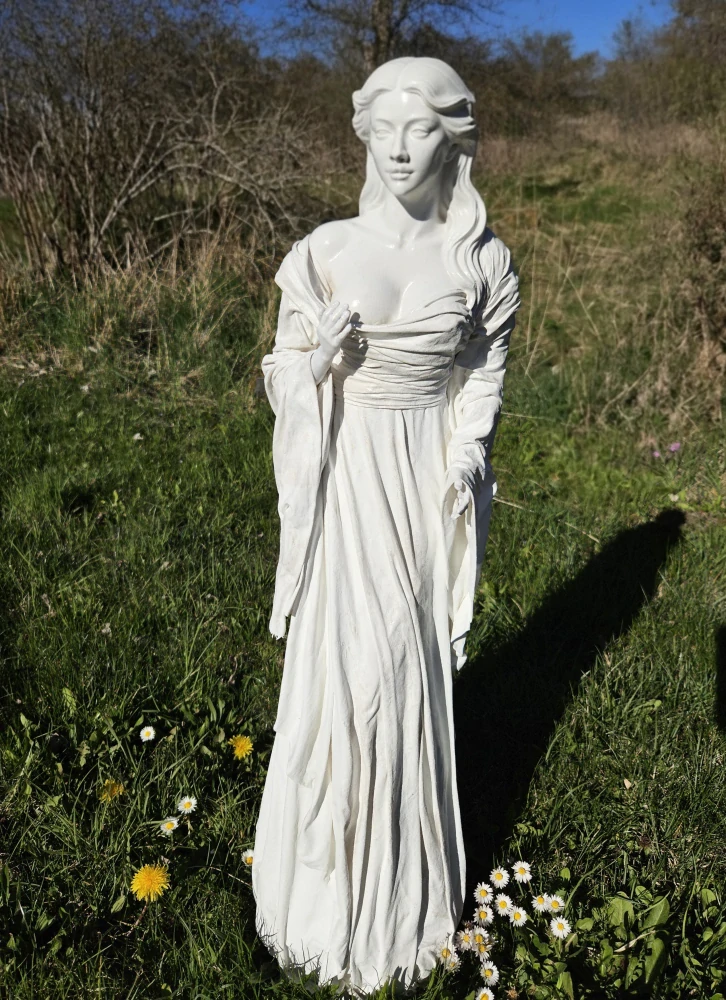 Tato ručně tvořená socha ženy vyniká svou něžností a přirozeným výrazem. Splývavé šaty a jemné detaily působí lehce a vzdušně, jako by se postava na okamžik zastavila v čase. Je ideální jako dekorace do interiéru i na zahradu, kde vytvoří klidné a harmonické místo.
