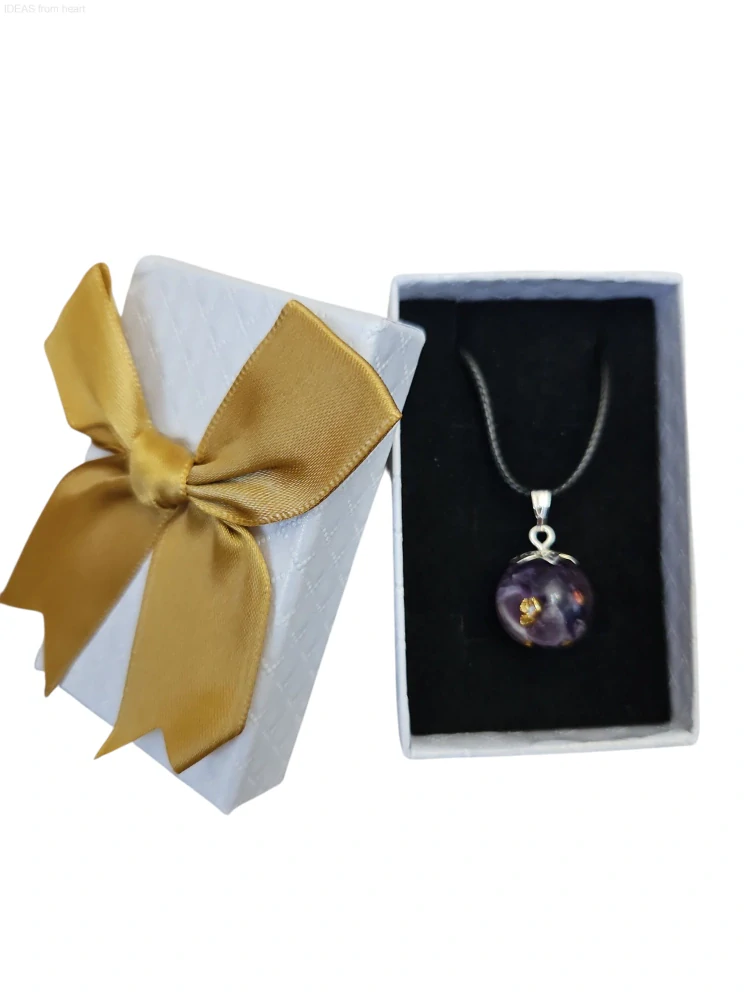✨ Ručně vyrobená orgonitová kulička o velikosti 2 cm s minerálem ametyst. Zavěšená je na šňůrce z imitace kůže a uložena v elegantní dárkové krabičce se zlatou mašlí – připravena potěšit jako osobní amulet nebo dárek z lásky.