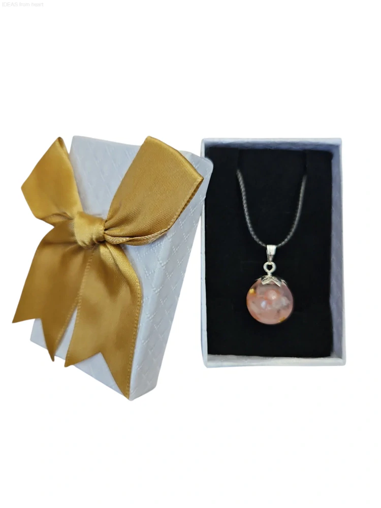 ✨ Ručně vyrobená orgonitová kulička o velikosti 2 cm s růženínem. Zavěšená je na šňůrce z imitace kůže a uložena v elegantní dárkové krabičce se zlatou mašlí – připravená potěšit jako něžný dárek i osobní talisman.