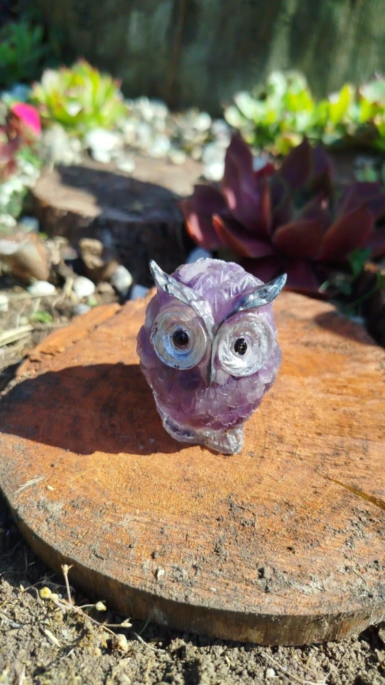 Tato jemná orgonitová sovička s ametystem je strážkyní vnitřního klidu, intuice a vyšší moudrosti. Je ručně odlitá z čiré křišťálové pryskyřice a v sobě ukrývá sílu ametystu – jednoho z nejduchovnějších minerálů, doplněného čirým křišťálem a kovovými šponami pro zesílení a harmonizaci energie.
