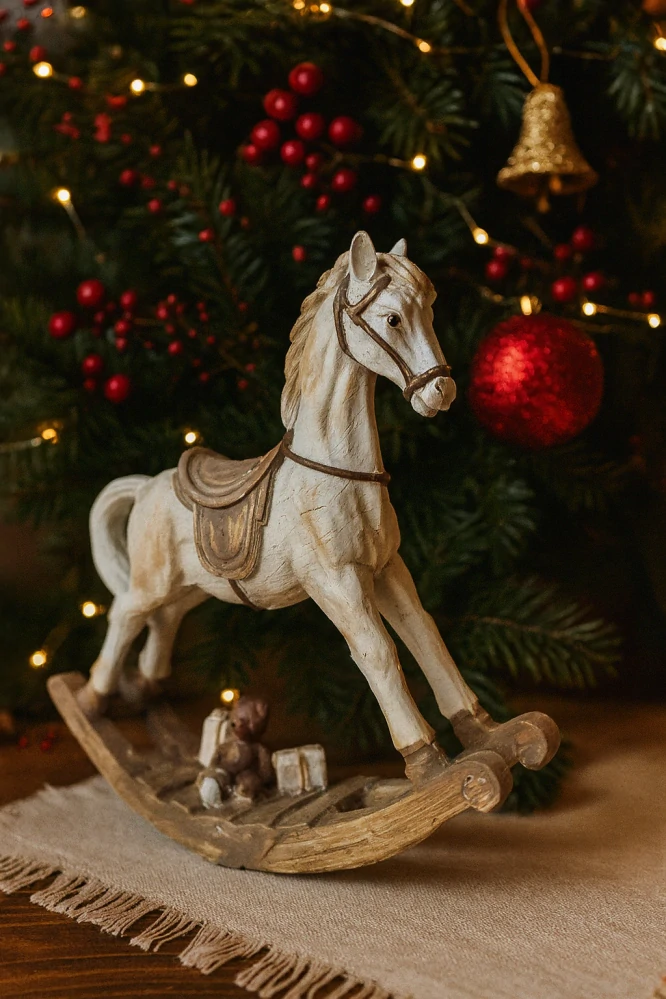 Krásná vánoční dekorace v podobě houpacího koníka s malými dárečky a medvídkem. Koník vnese do interiéru nostalgickou atmosféru Vánoc a hodí se jako ozdoba na stůl, poličku či pod vánoční stromeček.
