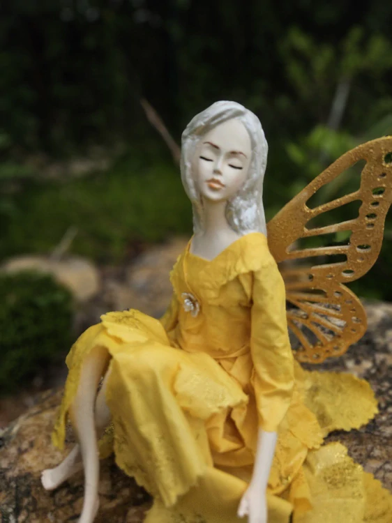 Tato něžná víla v barvách ranního slunce rozzáří každý interiér svou jemnou energií. Zářivě žluté šaty s krajkovými detaily a motýlí křídla ve zlaté patině jí dodávají vzhled letní víly prosvětlující domov svou přítomností. Její klidná, sedící postava působí jako ztělesnění světlého dne a radosti.