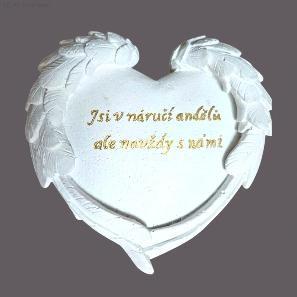 Toto bílé vzpomínkové srdce s reliéfem andělských křídel je něžnou a důstojnou připomínkou milované bytosti. Zdobí ho ručně psaný zlatý nápis: