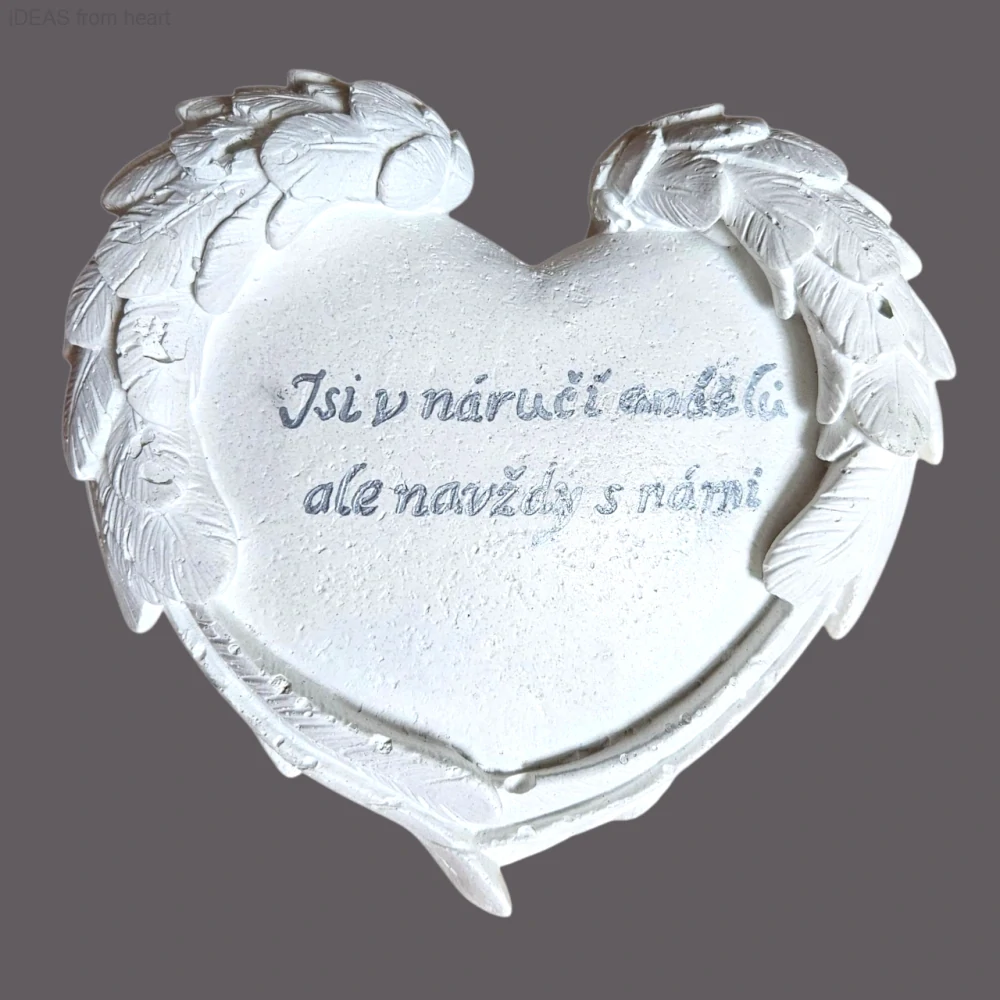 - Vzpomínkové srdce s andělskými křídly – „Jsi v náručí andělů, ale navždy s námi“- stříbrné písmo